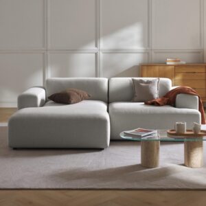 Sofá en L Ryan con relleno en espuma gris de alta densidad y tapizado en poliéster anti fluidos